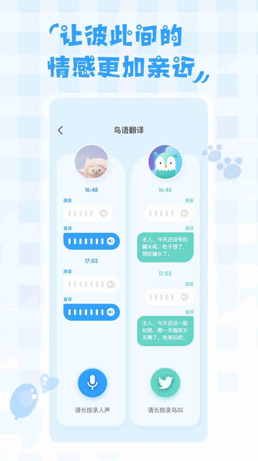 1、作为一款鸟语翻译器,它能够将鸟类的叫声翻译成人类能够理解的语言,让养鸟人能够更好地与自己的宠物沟通。