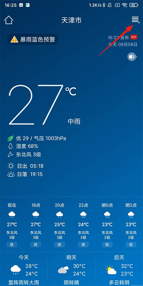 1、在本地天气预报首页点击右上角的四横线扩展按钮