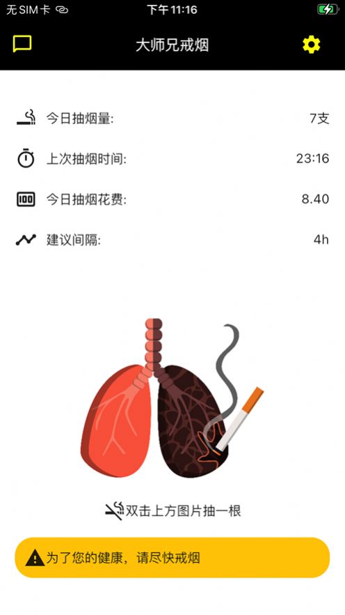 4、·这款应用非常简单,会计算你每天的香烟消耗量,你只要把它们记录下来就可以了,如果你没有记录下来更好,那说明你正在戒烟,它有一个计时器,从你抽完一根香烟开始计时。
