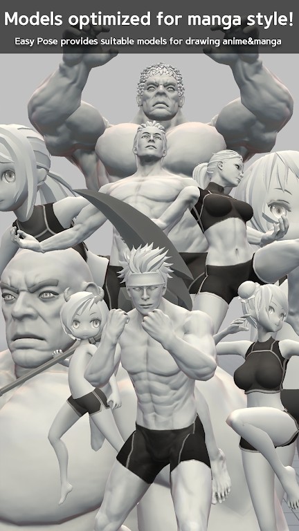 2、漫画风格模特-以前的姿势应用程序有许多逼真的8头男女比例,使其不适合动画,webtoon或游戏插图。EasyPose采用各种体型的模特准备。