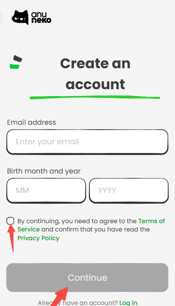 3、输入电子邮箱以及出生年月,然后打钩,点击底部Continue按钮。
