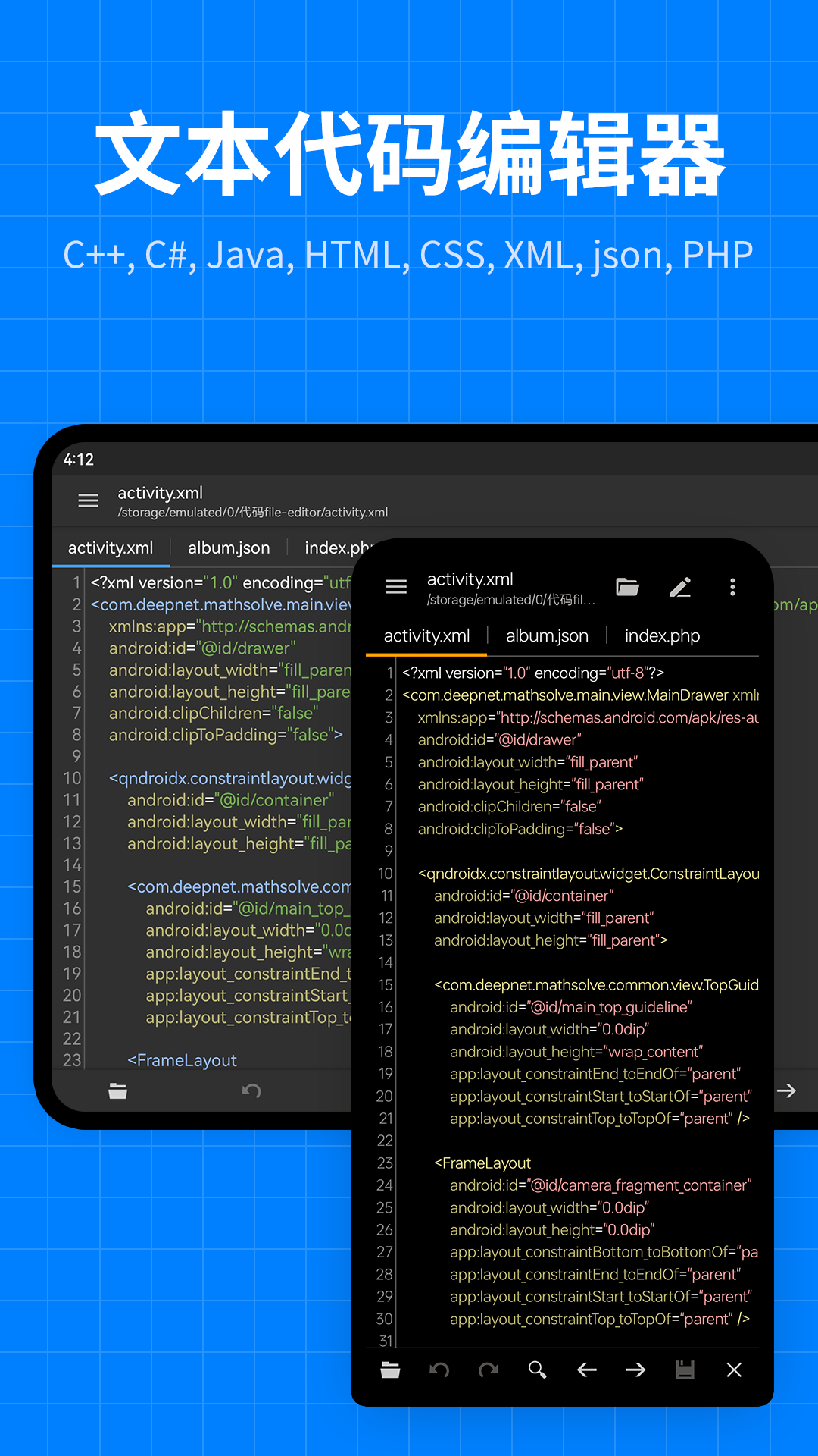 文本编辑器代码编辑App是专为安卓用户打造的轻量级代码编辑器,App界面十分简洁,拥有丰富的编辑功能,包括显示/隐藏、缩进、查询、替换字符等,更有超多实用的自定义设置,随时在线编辑超方便,为大家带来便捷高效的代码编辑服务,快点下载吧!