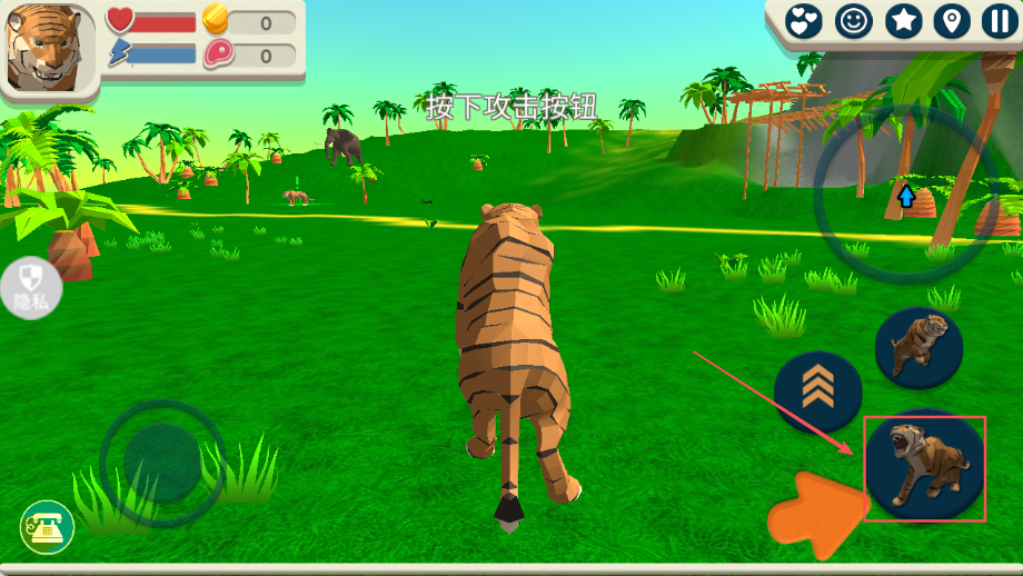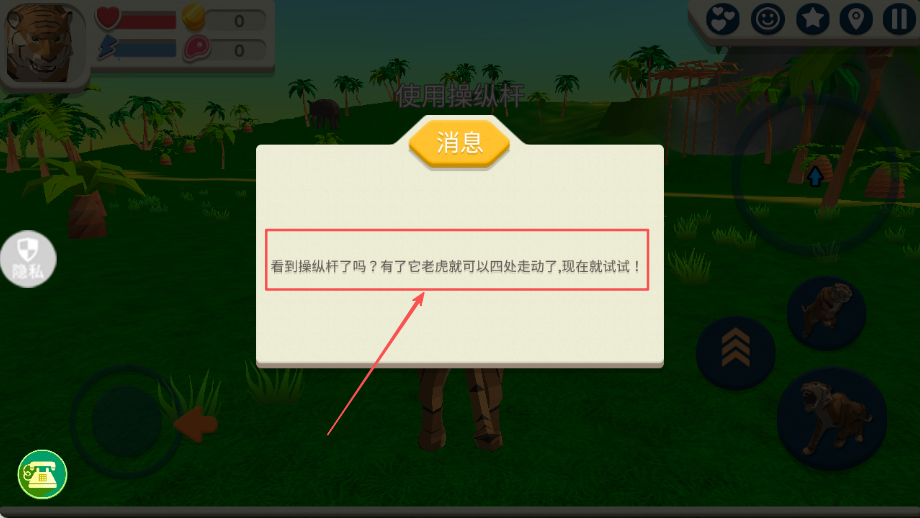 3、根据红框提示使用操纵杆控制老虎移动,完成教学,熟悉基本操作是后续游戏顺利进行的重要基础。