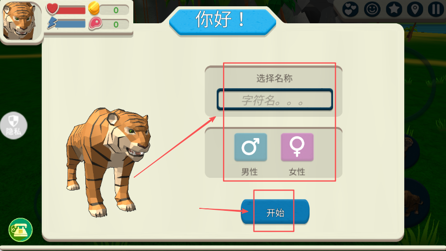 2、在角色创建界面输入名字并选择性别,点击开始按钮,个性化设置让玩家能够创造属于自己的独特老虎角色。