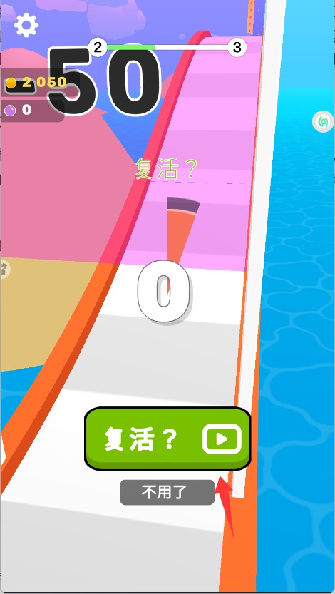 3、若小球掉落或撞击导致失败,可点击"复活"按钮消耗道具或观看广告继续挑战。