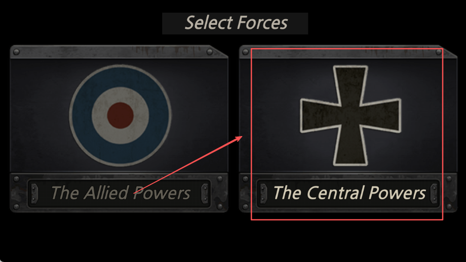 1、进入游戏选择所属部队,点击红色标记区域确定阵营,这个选择将影响后续可使用的战机和任务路线,需要慎重考虑。