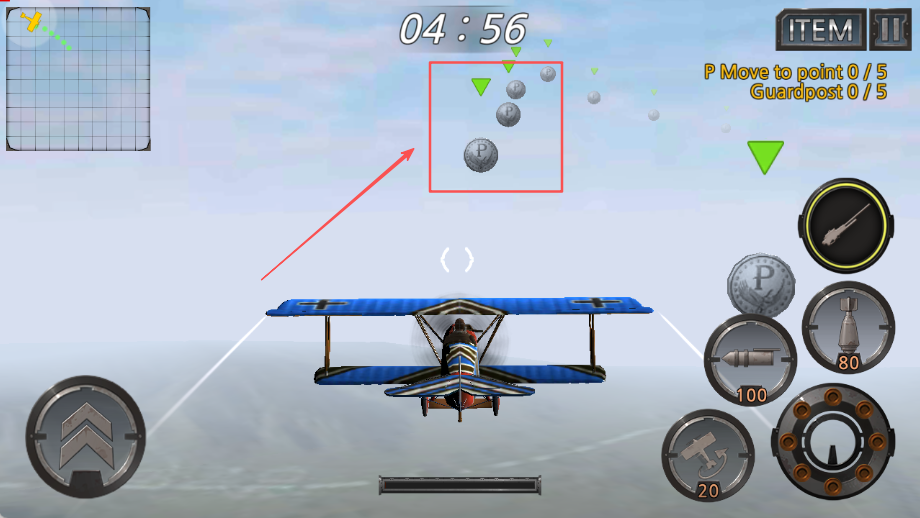 2、操控战机收集空中散落的游戏币,积累资源提升实力,这些资源可以用来购买新装备和升级武器系统,增强战斗力。