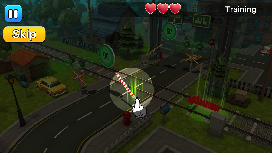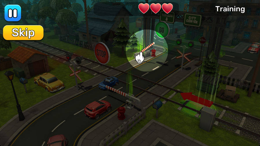 1、启动游戏后,根据指引控制道口信号灯与栏杆,确保火车与汽车通行安全。