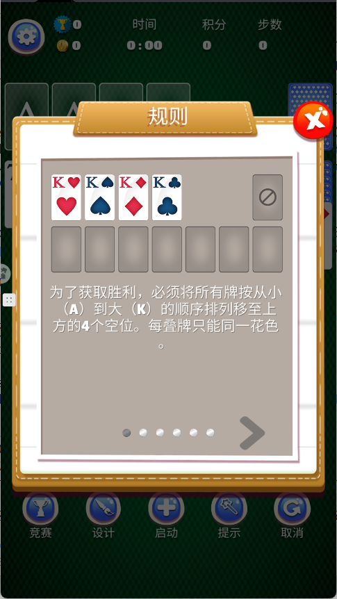2、 游戏内提供了清晰完整的规则说明,玩家可随时查看包括花色交替、数字递减及空位放置限制在内的所有核心玩法与细则。