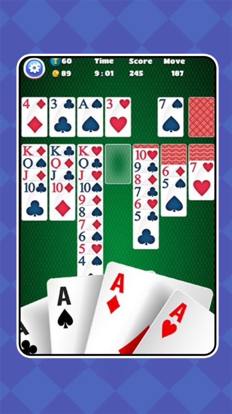 1、 游戏界面呈现经典的纸牌布局,玩家需对桌面与库存中的纸牌进行策略性分类,并遵循特定规则完成从大到小的顺序排列。