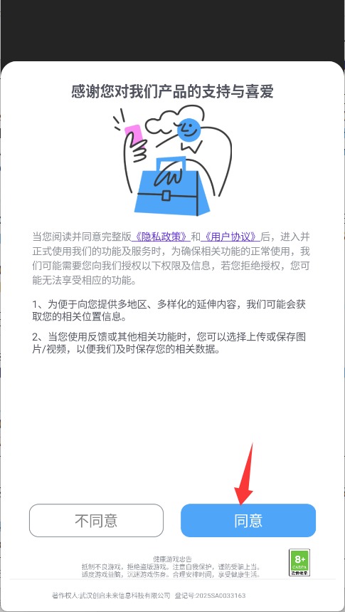 1、启动游戏后,请先仔细阅读并勾选同意用户协议与隐私政策,完成初始设置。
