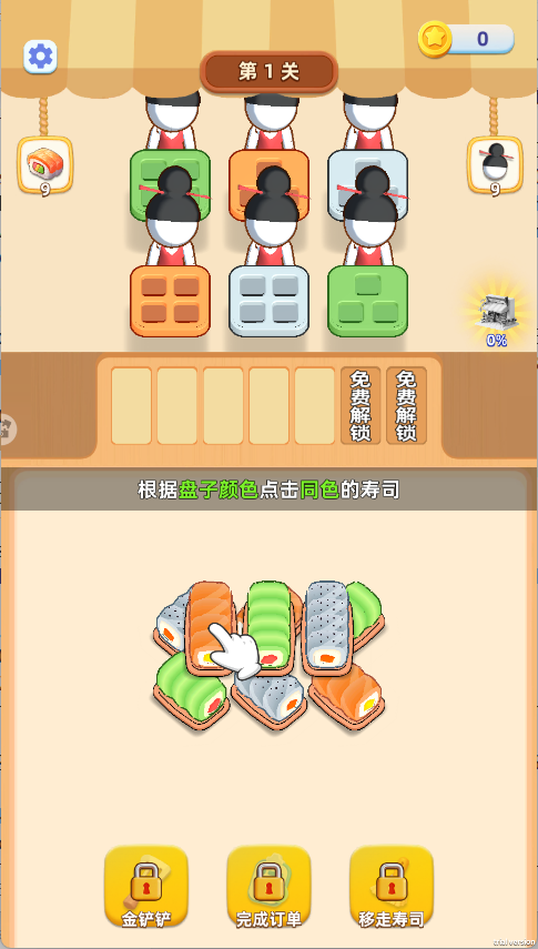 1、 玩家需从屏幕底部的料理台上,拖拽对应颜色与数量的寿司图标,将其放入上方等待服务的顾客拼盘中,完成颜色与形状的完美匹配。