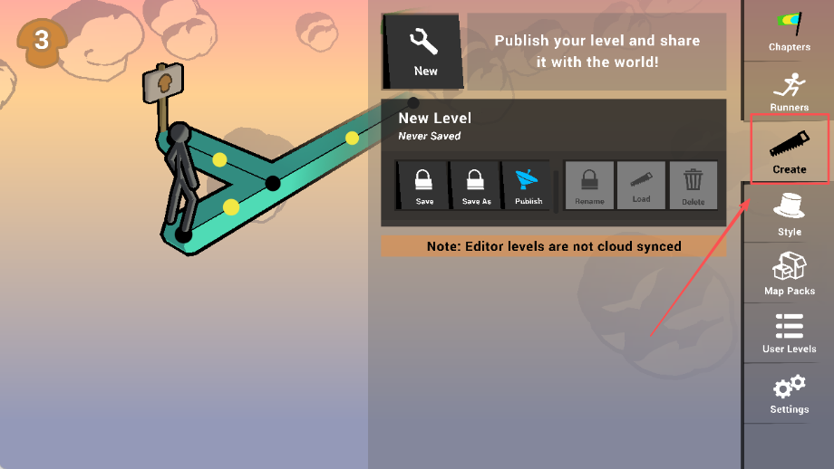 1、点击制作功能进入地图编辑,这是游戏的重要特色功能,允许玩家发挥创意设计专属关卡,需要熟悉编辑工具的使用方法和设计技巧。