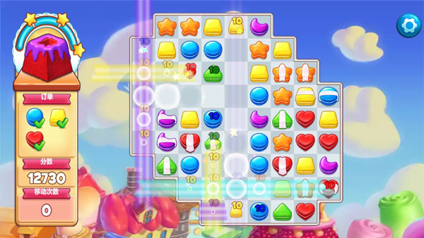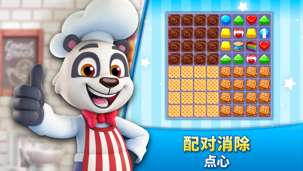 游戏完美遵循经典的三消规则,通过将两个连在一起的饼干互换位置以达成消除,期间只有三个或三个以上的串联饼干才能消除,且数量越多所获得积分也就越多,而且消除后所遗留的糕点还能在后期为你带来更多的积分效益。