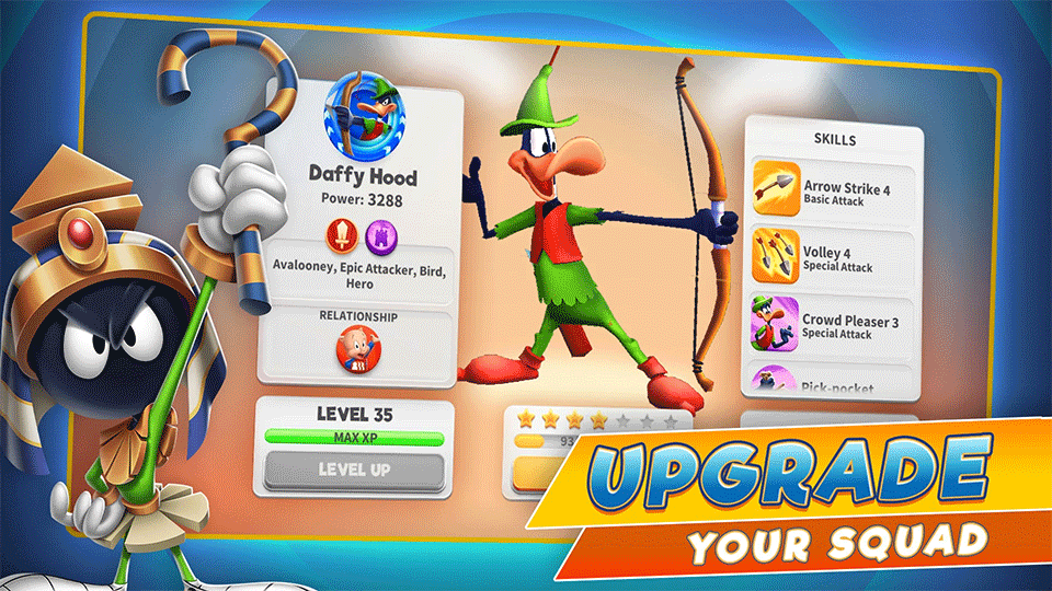 乐一通混战世界(Looney Tunes World of Mayhem)是一款卡通风格的角色扮演游戏,在游戏中玩家将和经典动画片的不同的角色并肩作战,玩家需要不断解锁不同的卡通角色来组成强大的队伍,控制每一个角色的技能出招来打败敌方的所有队伍,快来季节你认为最强的队伍加入战斗吧。