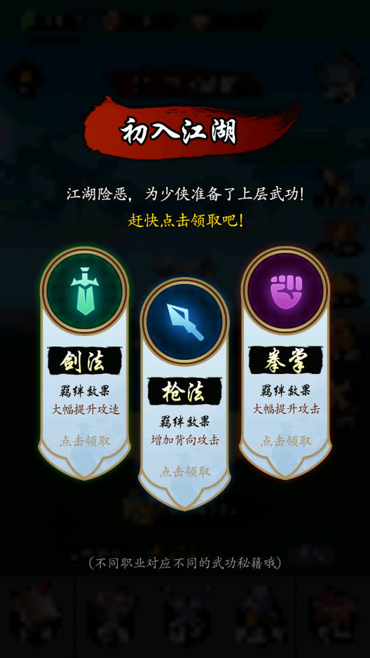 1、游戏开始时,玩家可以选择一个职业,不同职业可以学习不同的武功。