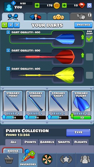 回到首页点击“飞镖”按钮,即可进入飞镖管理页面,在飞镖页面中,你可以购买不同类型的飞镖组件,并对它们进行升级。提升飞镖的各项属性能够显著增强你的投掷表现,更轻松击败对手。