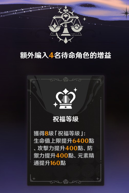 如图:初始多4名角色就会提供大量属性,后续元素BUFF点满还会进一步提高属性。