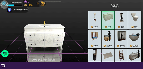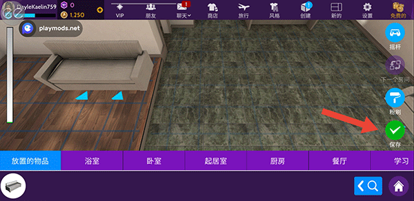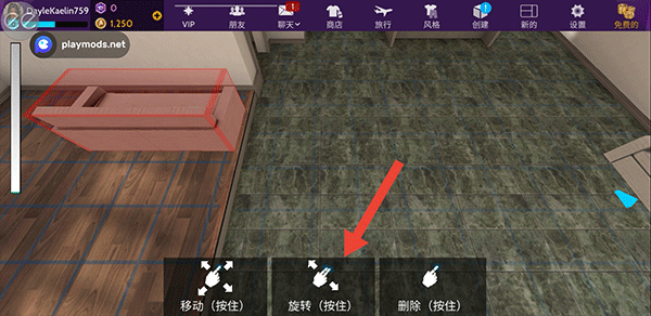 6、选择物品后,长按物品将它拖到房间的地板上,然后通过移动旋转等操作将它放置在合适的位置上