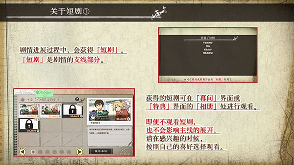 1、玩家在丰裕之角的剧情进展过程中,会获得【短剧】。短剧是剧情的支线部分。获得的短剧可在【幕间】界面或【特典】界面的【相册】处进行观看。即便不观看短剧,也不会影响主线的展开,请在感兴趣的时候,按照自己的喜好选择观看即可。
