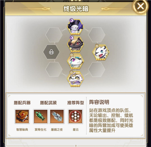 站在游戏顶点的队伍,无论输出、控制、续航都是极致搭配,同时光暗的阵营加成可使英雄属性大量提升。