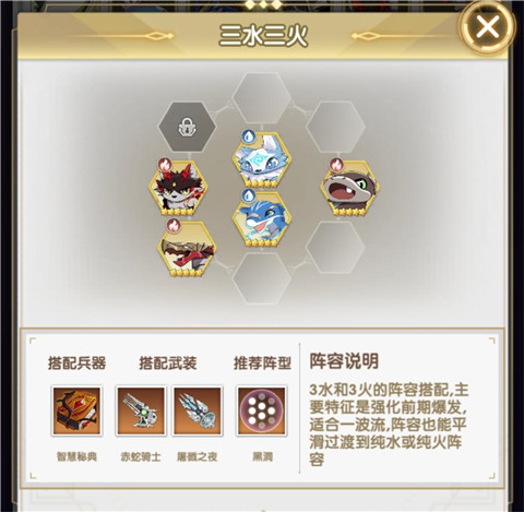 3水和3火的阵容搭配,主要特征是强化前期爆发,适合一波流,阵容也能平滑过渡到纯水或纯火阵容。